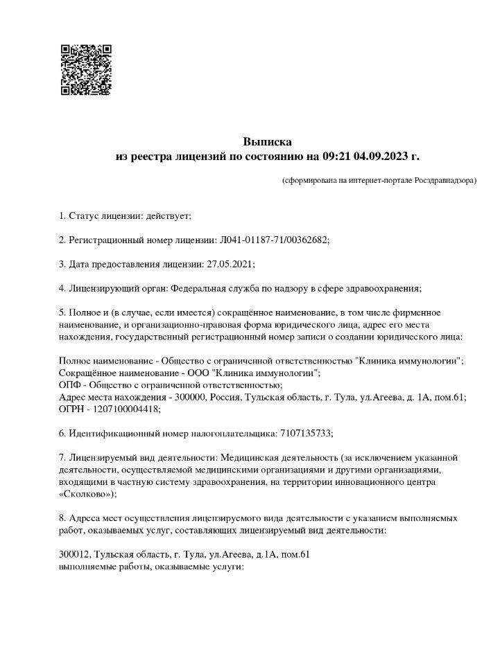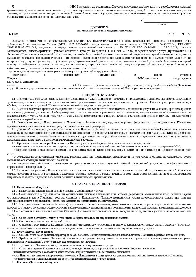 ООО «Клиника Иммунологии» не оказывает медицинскую помощь в рамках программы и территориальной программы государственных гарантий.